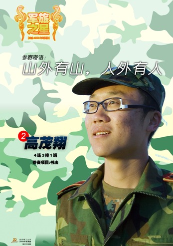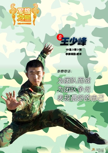 现在我们已选出十名优胜者,分别为“舞蹈之星”,“武术之星”,“书法之星”,“内务之星”,“团队之星”,“快乐之星”,“漫画之星”,“演讲之星”,“军歌之星”和“体育之星”。我们为他们制作了大幅海报,分别在学校和军营进行了宣传。校电视台的同学对比赛过程进行了录制,并制作成短片放在世纪京工网站上。