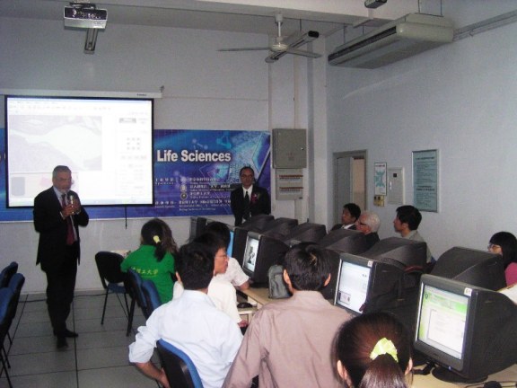 下午在中心教学楼424多媒体教室,由意大利博洛尼亚大学生物技术学院院长Lanfranco Masotti教授和Patrizia Brigidi教授就远程控制技术在生命科学教学中的应用做学术报告,并现场演示。通过网络实现远程控制,操作位于博洛尼亚大学实验室中的仪器,对组织切片和生化指标检测信号进行观察和测量。