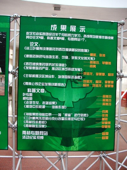 9月17日以来,北京理工大学校团委,生命科学与技术学院,校科协联合在中教大厅举办"北京理工大学赴西双版纳社会实践科普展",本次展览不仅反映了今年暑假我校西双版纳社会实践团开展的各项实践活动,同时结合科普宣传,将社会实践活动终的部分成果转化为科普教育,效果明显.