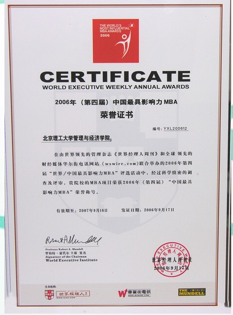 9月17日,由著名财经杂志《世界经理人》周刊和《蒙代尔》联合举办的2006年度世界经理人高峰会暨中国最具影响力MBA排行榜发布会于在香港隆重举行。我校MBA教育荣获第四届“中国最具影响力MBA”荣誉称号。这标致着经过10余年的发展,我校MBA教育已经成为中国较具影响力和品牌效应的MBA教育之一。随着我国大环境不断市场化、正规化,我国企业不断的发展壮大,我校广大的MBA毕业学员将有广大的用武之地。
