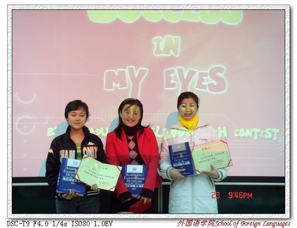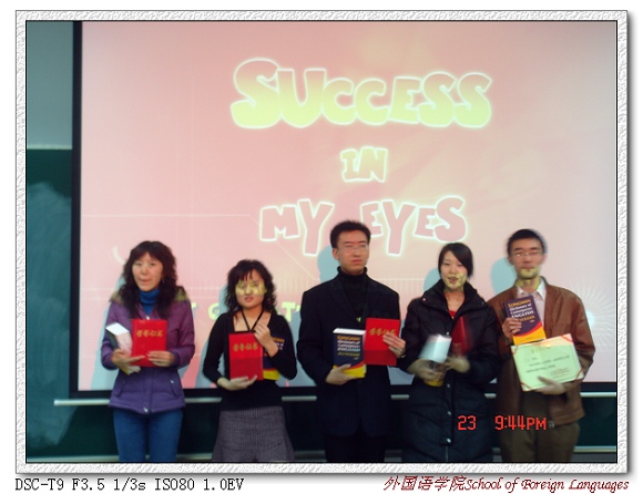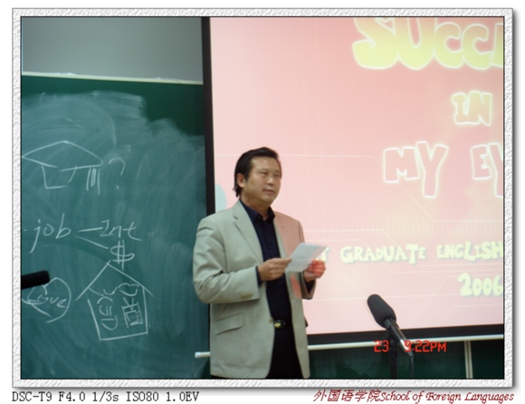2006年11月16日在研究生楼301和501同时进行了初赛。来自全校各个学院的37名硕士生和博士生同台竞技。最终16名选手脱颖而出进入决赛。决赛现场气氛十分热烈。讲台上,参赛选手声情并茂,洋洋洒洒,详尽阐述 “Success in My Eyes”。问答环节,面对提问教师频频“刁难”,他(她)们机敏应对,精彩连连。讲台下,听众的呼声掌声一浪高于一浪。经过激烈的角逐和评委们的认真评判,决赛共评出了一等奖3名,二等奖5名,三等奖7名。