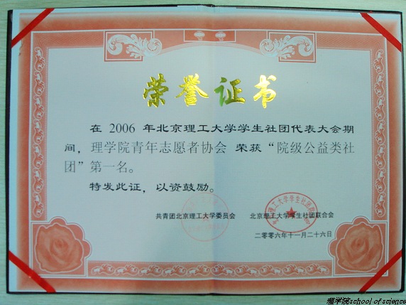2006年11月26日,理学院青年志愿者协会在校社团联合会举办的全校社团评优中取得了公益类社团第一名的好成绩。此前的评优中,理学院青年志愿者协会曾获得校“十佳社团”、“最具潜力社团”、“最佳人气活动”等称号,这些荣誉一直激励着青年志愿者不断努力向前,无私奉献。