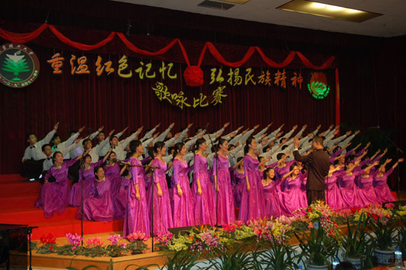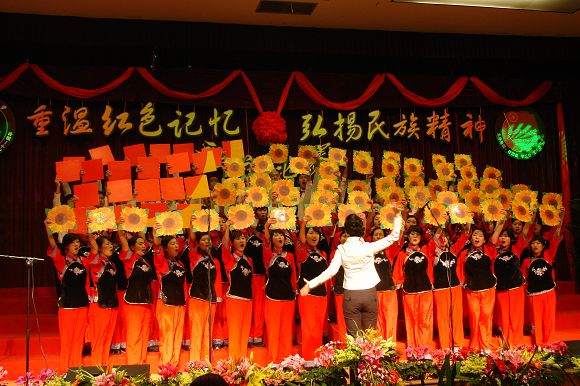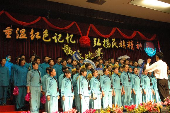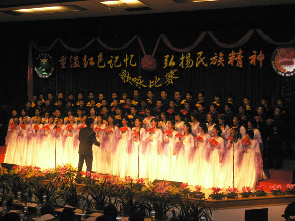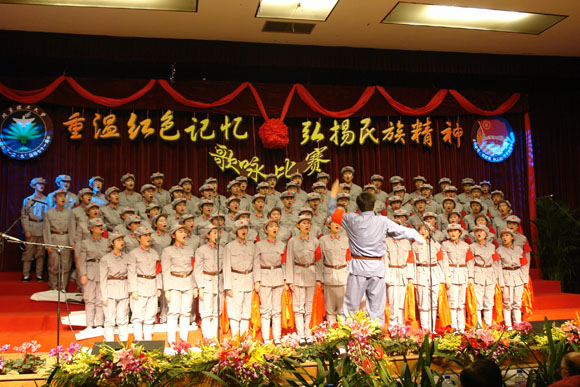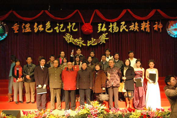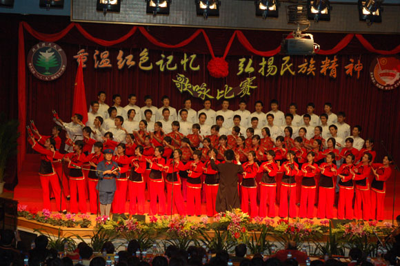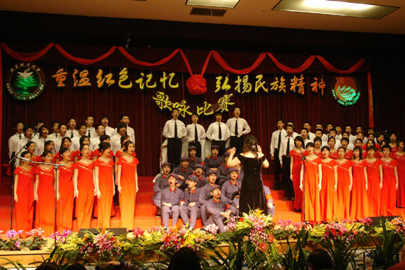 在前期各参赛队表演过后,我们迎来了延河歌唱团的老前辈们,一身青衣,一头白发,年逾花甲的他们同样为我们带来了红军的故事。一曲《娄山关》带给我们所有人一种回忆,一份思念。也许他们声音不再圆润,也许他们的歌喉不再清脆,但他们对于老一辈革命先烈的感情却是最浓烈的。《红军哥哥回来了》,将赛场上的气氛再一次推向了高潮。历史将岁月的风霜刻在了他们脸上,他们,在今天将自己对祖国的一腔热血流在了同学们的心中。青春不再,真心不改。