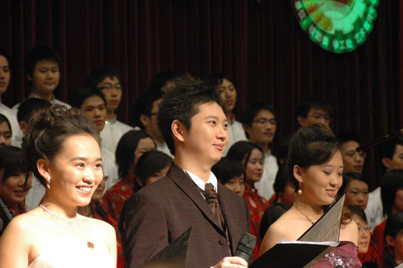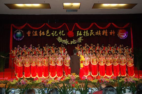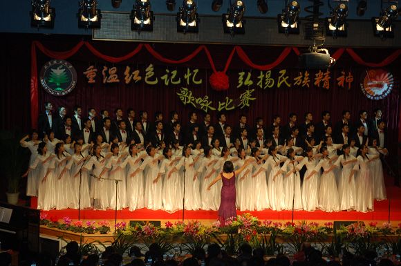 “化工化工,谁与争锋”,带着这样的气势这样的决心,化工学院登场,同样是礼服晚装,但晚装鲜红的色就像战场上的一面面旗帜明,带我们重温红色的岁月。“天如火,水似银,横断山,路难行”,他们带来的是《四渡赤水出奇兵》,曲调时快时慢,时而明快,时而含蓄,仿似红军用兵的神奇莫测,战斗的艰险异常。而在歌曲的高潮部分,他们打出了黄色的丝绸,红色的彩带,他们的歌声就像漫天飘舞的彩条般绚丽,烂漫。七十年的风雨坎坷,七十年的岁月蹉跎,他们同样带给了我们《当代中国之歌》,唱出新时代的朝气,唱出新时代的活力。