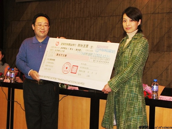 何丕应基金会成员、何丕应老师长子刘刚代表基金会向北京理工大学理学院捐赠基金,理学院分党委副书记、副院长姜艳老师代表理学院接受捐赠。