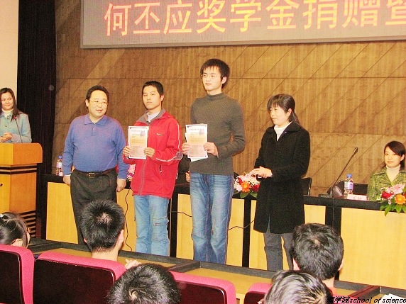何丕应基金会于2006年10月成立,并于11月初向理学院各班级下发了《关于做好首届何丕应奖学金评选工作的通知》,共收到2003、2004级应用物理专业8名同学的申报材料,经何丕应奖学金评选委员会认真筛选和民主合议,最终确定2003级物理系本科生段晓溪和2004级物理系孟虎两名同学获得2005-2006学年“何丕应奖学金”荣誉称号,各奖励每人奖学金1000元。