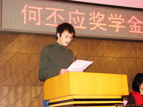 首届“何丕应奖学金”获奖代表、理学院2003级物理系本科生段晓溪同学发言。他表达了对何丕应老师的敬仰之情,并表示一定在何老师精神的鼓舞下,好好做学问,好好做人,尽最大的努力在自己所选择的物理道路上走得更远。