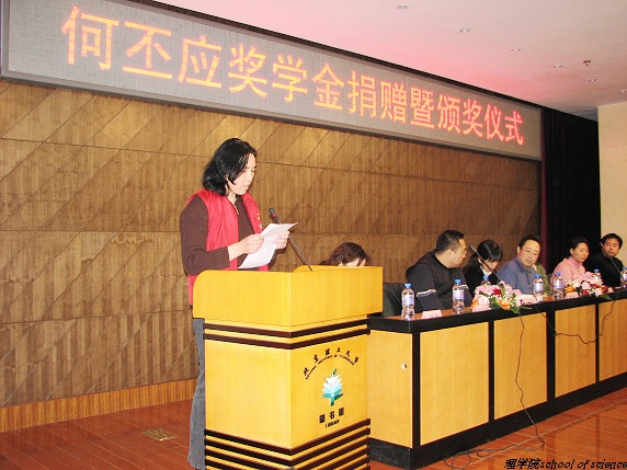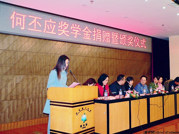 2006年12月8日下午,理学院何丕应奖学金捐赠暨颁奖仪式在图书馆报告厅隆重举行。学生工作处副处长娄秀红,何丕应基金会成员、何丕应老师长子刘刚,次子刘宁及儿媳靳红霞,陈岚,理学院分党委副书记、副院长姜艳,理学院副院长胡海云及理学院物理系党支部书记王锋等出席了何丕应奖学金捐赠暨颁奖仪式。