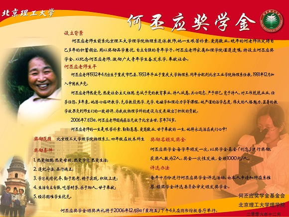 为了纪念何丕应老师自立自强、艰苦奋斗的生活态度和严谨为学、勤于实践的科学精神,激励广大理科学子心系祖国、勇攀科学高峰,何丕应基金会在北京理工大学理学院设立何丕应奖学金基金(10万元)。