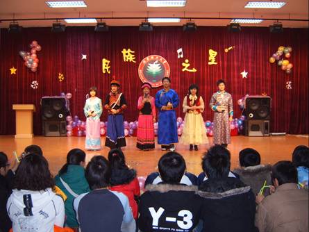 晚会共分为三个环节:校园社团节目表演、各班精品节目及“校园民族之星”决赛。晚会在一曲《开门红》歌舞中拉开帷幕,现场气氛骤然升温,同学们挥舞着手中的荧光棒,掌声笑声不断。接着民族、现代各种风格的班级节目陆续上演,精彩叠出,小礼堂成了一片欢乐的海洋。穿插在节目中的三次抽奖活动提高了观众的热情,近90名一、二、三等奖各归其主。精品经过全校同学中选出的42名大众评审对九个节目进行现场投票,从各班精品节目当中评出前三名精品节目:4班以表现青春期爱情酸甜苦辣的小型音乐剧得到最高的16票,获得桂冠;8班的情歌对唱《屋顶》及7班的摇滚歌曲In the end分获二、三名。