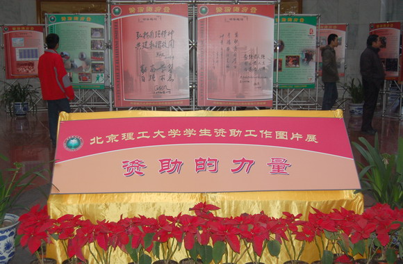 在送温暖活动仪式开始之前,与会人员首先参加了在中心教学楼一层大厅举行的“资助的力量——北京理工大学学生资助工作图片展”剪彩仪式。图片展围绕北京理工大学资助工作的基本情况、工作模式、工作成效等内容设计制作了40余张展板,形象生动地展示了北京理工大学学生资助体系的概况、学生资助工作已经取得的成绩以及以贫困生为主体的学生自强社及服务大队成立以来开展活动的情况。学校领导还纷纷挥毫为本次展览题了词,校党委书记焦文俊的题词是:“弘扬自强精神 共建和谐校园”;校长匡镜明的题词是:“勤奋学习 自强不息”;常务副校长李志祥的题词是:“把资助贫困学生的工作做好,把阳光播撒人间”;党委副书记、副校长杨宾的题词是:“经过努力,我们做到了没有让一个贫困学生因经济困难而辍学;经过再努力,我们要让每一个贫困学生都能健康快乐地学习生活;经过加倍努力,我们要实现让每一个贫困学生都能品学兼优,成为理想坚定,志存高远,服务人民,奉献祖国的出色人才!”