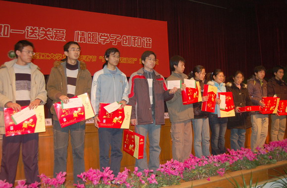 学生工作处处长刘明奇同志主持了随后举行的送温暖活动仪式。会上,学校领导首先为“我的自强之路”征文比赛获奖代表进行了颁奖,然后为学生代表发放了寒假往返路费、慰问品,并向他们赠送了由学校领导老师书写的春联。