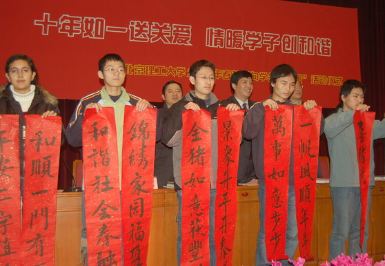 今年是北京理工大学开展春节向“学生送温暖”活动的第十个年头,十年来,这项活动得到了学校领导的高度重视和大力支持,现已成为北京理工大学具有传统特色的工作之一,而且其活动的形式越来越新颖,内容越来越丰富,对学生的关怀越来越人性化。“资助的力量——北京理工大学学生资助工作图片展”不仅吸引了许多受资助同学驻足观看,许多在中心教学楼工作学习的师生也都在展板前仔细体味着学校对学生的关爱与真情。“把学校的祝福捎回家”向学生送春联活动吸引了众多的观众,大家在赞叹书写春联师生书法功底的同时,也都不失时机的上前索取一份春联带回家。整个中教一层大厅里人头攒动、热闹非常,处处洋溢着喜气祥和的氛围。