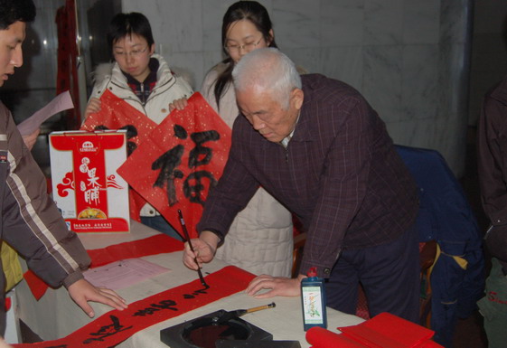 送温暖活动仪式结束后,学生们纷纷带着学校为他们提供的春联自选目录,请学校精于书法艺术的领导、老师和同学为自己现场书写一幅春联。学校还特地为时间比较紧张的同学准备好了事先书写好的春联,学生可以依照春联自选目录上的序号到中教门口的志愿者那里领取,然后把这红彤彤的春联和春联里暖洋洋的情谊一起捎回家。