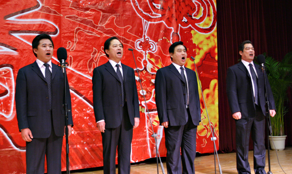 校党委副书记侯光明、副校长赵显利、工会常务副主席蔡本睿、应邀到场并分别做了热情洋溢的讲话。后勤办主任巫后新、工会副主席王建光、后勤办副主任谷千军、后勤集团党委书记李盼兴、副书记姜金凤、膳食部副主任张小云、陈朝阳与总务后勤部所属各部门四百余名员工济济一堂,歌会在后勤集团杨学洲总经理振奋人心的新春贺辞中奏响了序曲。