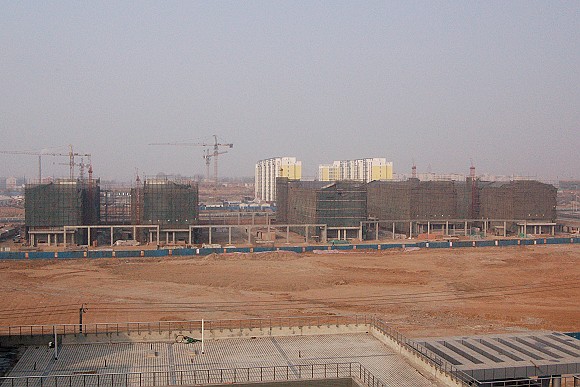 图书馆现场图, 西侧地下室部分正在挖土,东侧换填完成,平整场地完成。