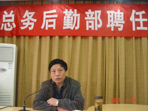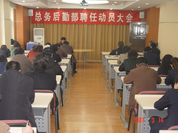 按照后勤集团全员聘任工作的安排,2007年3月14日下午,在后勤办公楼二层报告厅召开了“总务后勤部聘任工作动员会”。后勤集团党委书记李盼兴、副书记姜金凤,总务后勤部主任杨学洲、副主任丁志坤、宋希博、徐承俊,经理助理周惠民、谭新华、总工助理朱建学,各中心正副主任、班组长及部分职代会代表参加了动员会。