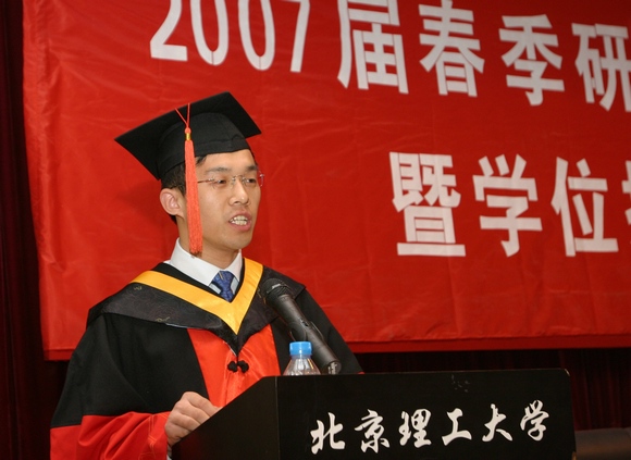 信息科学技术学院博士毕业研究生董立泉同学代表2007届毕业研究生发言。他用充满激情的言语感谢多年来北京理工大学给予的教育培养,感谢多年来老师们的言传身教,感谢多年来校园军工文化氛围的熏陶。最后代表毕业生同学们表示决不辜负学校的培养,一定创造人生的辉煌!