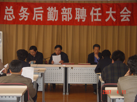 2007年4月11日下午,在后勤办公楼二层报告厅召开了总务后勤部科级干部聘任宣布大会。后勤集团党委书记李盼兴、副书记姜金凤、集团总经理 总务后勤部主任杨学洲、副主任丁志坤、宋希博、徐承俊以及各中心正副主任、班组长和部分职代会代表70余人参加了干部聘任宣布大会。会议由宋希博同志主持。