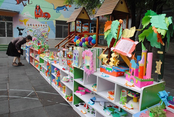 这天的幼儿园更像童话中的乐园,从院子里到教室中,从操场上到各个角落都散播着斑斓的色彩和快乐的音符:多彩绚丽的气球、彩旗把院子打扮得像个花园世界,一盆盆的鲜花更增添了自然的芬芳;富有民族特色的红灯笼宛如串串红宝石镶嵌在长廊上,分外耀眼;最夺目的还是孩子们的绘画作品和手工作品,它们是童话中王子和公主的礼物,是献给最亲爱的爸爸、妈妈和爷爷、奶奶、老师们的珍贵礼物。