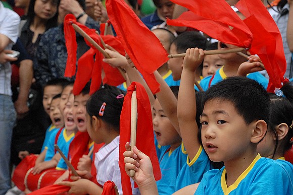 第一个节目是大班幼儿表演的“腰鼓操”,音乐响起来了,孩子们欢腾地跑入表演场地,欢庆的锣鼓洋溢着喜气,热情的舞姿在红绸的海洋里跳动,抒写孩子们喜迎奥运的快乐篇章。