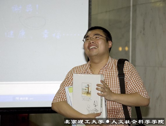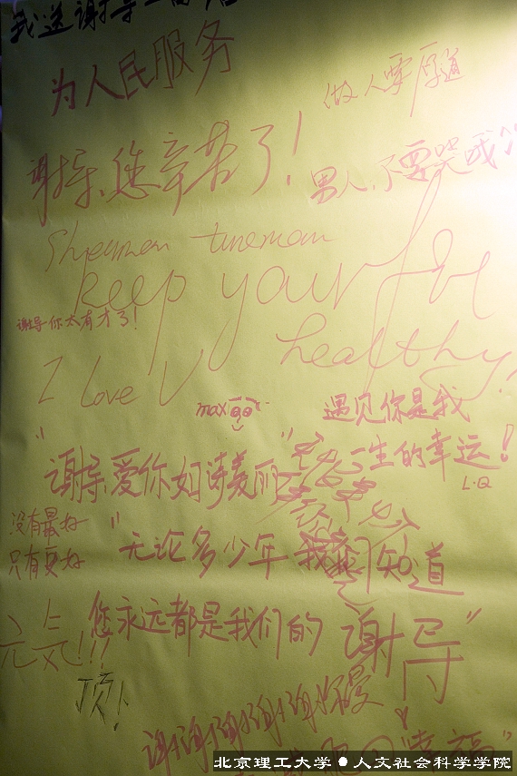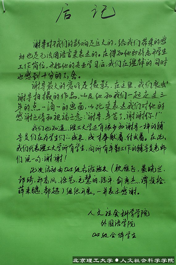 在活动的尾声,在场的2004级同学代表向谢老师赠送了欢送会上最贵重的礼物——由人文学院、外语学院2004级每位同学写给谢老师的“离别寄语”,以表达自己诚挚的祝福。