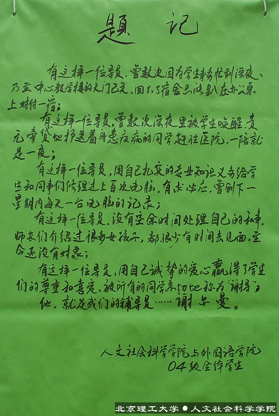 7月5日晚18:00,一个特殊的图片展在中心教学楼一层大厅迅速地布置完成,经过一个多月的“秘密”准备,人文学院和外语学院两院的学生干部和2004级的同学们要在这里为他们即将卸任的辅导员谢尔曼老师送上一份意外和惊喜。