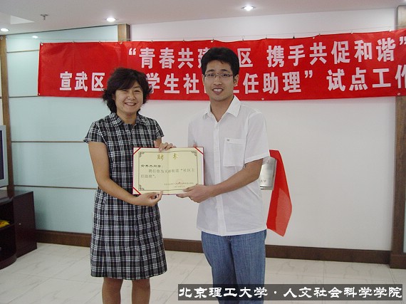 7月19日下午4点,我校人文社会科学学院与北京市宣武区人民政府天桥街道办事处联合开展的“宣武区‘大学生社区主任助理’试点工作启动仪式”在天桥街道办事处会议室举行。