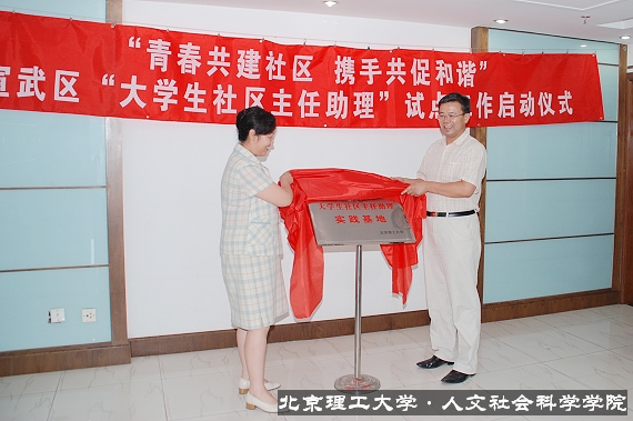 宣武区区委副书记杨素荣和北京理工大学党委副书记赵平为“大学生社区主任助理实践基地”揭牌。