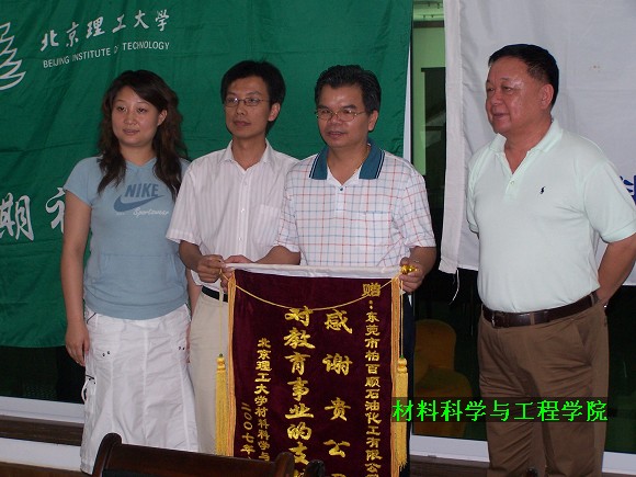 最后,周政懋老师代表北京理工大学材料科学与工程学院向柏百顺石油化工有限公司赠送了锦旗,感谢柏百顺石油化工有限公司一直以来对学院教育事业的大力支持。