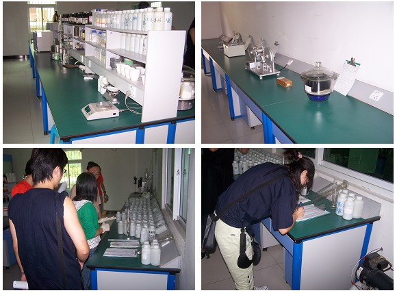 热带风暴带来的大雨挡不住材料科学与工程学院赴广东社会实践团的行程,通过昨天一天对柏百顺公司的创业发展历程、管理结构、办公实验环境等情况有了初步的认识后,今天我们走进实验室,进行了切身的体验。整齐排放的试剂瓶、烧杯以及详实的实验记录,无处不透露着公司严格的管理和工作人员们严谨的工作作风。陪同的工作人员耐心的跟我们讲解了如何进行配料,记录各种参数等步骤后,同学们也动手亲自操作起来。