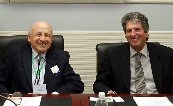 诺贝尔化学奖(1998年)得主沃尔特·科恩(Walter Kohn)教授(左)和正确生活方式奖(又名诺贝尔环境奖,2002年)得主马丁·格林(Martin Green)教授(右)被聘为北京理工大学名誉教授。聘任仪式由杨树兴副校长主持。