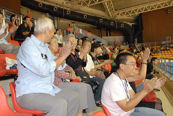由于是周末,与前两天相比,当日看台上多了许多自费购票的观众。八岁的杨子天和爸妈一起观看比赛,他说以前很少到现场观看体育赛事,更别说残疾人的了。今天能来特高兴。子天的爸妈都在北京外国语大学工作,距离盲人门球的比赛地很近。爸妈考虑到明年北京奥运会和残奥会举办期间到现场观看比赛的可能性极小,因此采取了提前感受奥运会的“措施”。子天的妈妈说:“其实我还有一个目的,是想让她在看比赛的过程中受教育。”果然不出她所料,子天说:“原来我觉得考试太难了,可是他们盲人比我还难。”