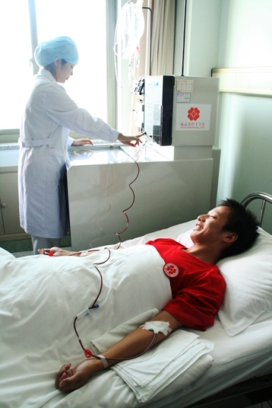 8点30分,外周血采集正式开始,俞锦声同学左右手臂各连接一次性导管,他的血液经外周循环后,分离出可供救助白血病等血液病患者的50-100毫升的造血干细胞混悬液。经过4个小时的分离,分离成功,凝聚着北理学子爱心和生命的干细胞,在第一时间送往机场,直接飞赴远南方,将注入另一个17岁生命的体内,将挽救另一个鲜活的生命。捐献后,俞锦声身体状况一切正常,遵照医嘱卧床静养,预计24日即可返校上课。