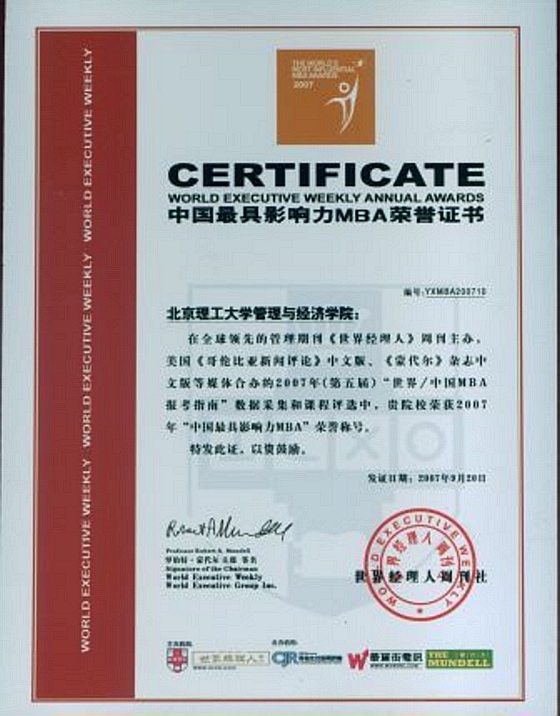 在全球领先的管理期刊《世界经理人》周刊主办,美国《哥伦比亚新闻评论》中文版、《蒙代尔》杂志中文版等媒体合办的2007年第五届“世界/中国MBA报考指南”数据采集和课程评选中,北京理工大学MBA项目荣获“2007年中国最具影响力MBA”荣誉称号。