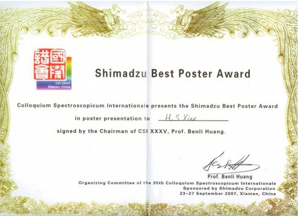 应大会邀请,我校理学院化学物理研究所张韫宏教授带领小组成员参加了此次会议。2004级博士研究生肖寒霜同学荣获了“Shimadzu Best Poster Award”。