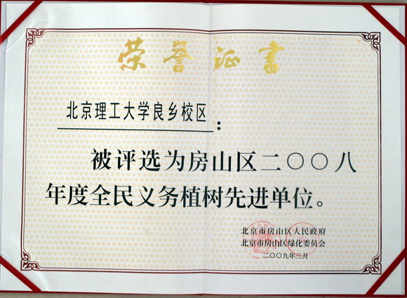 2009年3月12日,房山区绿化委员会在区政府召开了“房山区第二十六次绿化美化表彰暨动员大会”。北京理工大学良乡校区荣获 “首都绿化美化花园式单位市级先进集体”、“首都绿化美化花园式单位区级先进集体”和“房山区2008年度全民义务植树先进单位”。