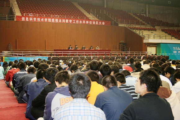 为了进一步加强信息学院学风建设,营造良好的学习氛围,值此本科教学评估之际,信息科学技术学院隆重举行主校区全院学生本科教学评估动员大会,这是学院成立以来首次全院学生参加的大会,也反映了全院师生对本科教学评估工作的重视和努力。信息科学技术学院迎接本科教学工作水平评估动员大会于2007年10月25日晚6点准时开始,学院全体本科生、硕士研究生、博士研究生共计5000余名学子齐聚体育馆参加了此次大会。