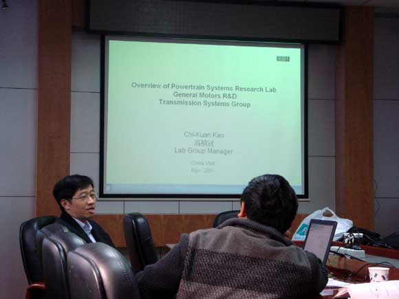 通用汽车公司Chi-Kuan Kao博士介绍了此次来访的目的和通用汽车研发中心情况,然后详细介绍了中心下动力传动系统研究实验室的项目、专长和设备,明确了合作的需求领域,并就"传动系统关键技术及其挑战"进行了学术交流。
