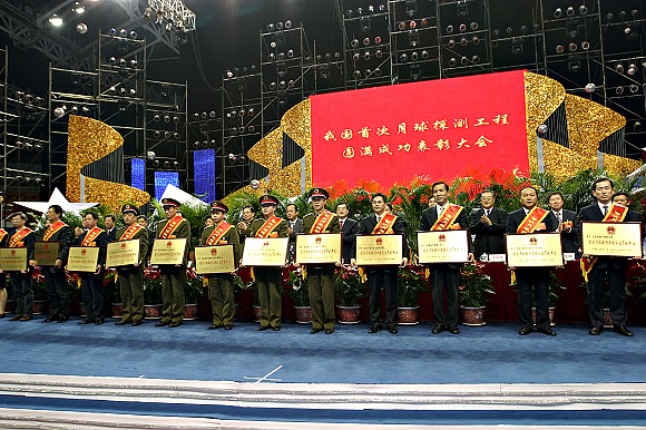12月12日下午,我国首次月球探测工程圆满成功表彰大会在我校体育文化综合馆隆重举行。表彰大会由国防科学技术工业委员会主办,旨在表彰先进,激励斗志,动员、团结和凝聚各方面力量,进一步组织实施好月球探测工程,为航天事业和国防科技事业做出新的更大贡献。会上,人事部、国防科工委、国资委、总装备部和中国科学院联合对在我国首次月球探测工程研制、建设、发射、测控和科学应用等各项任务中做出突出贡献的单位和个人进行表彰,授予国防科工委月球探测工程中心等22个单位“首次月球探测工程突出贡献单位”称号;授予栾恩杰等200名同志“首次月球探测工程突出贡献者”称号。
