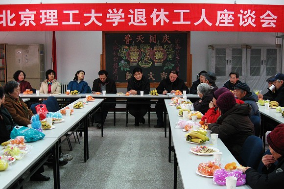 2008年1月18日下午,学校召开了退休工人座谈会。参加会议的有副校长赵显利,直属单位党委书记王悦音,后勤集团党委书记巫后新,党办副主任张瑜,人事处副处长黄晓鹏,国资处副处长谷千军及有关单位的负责人。居民管理委员会主任韩棋同志主持会议。