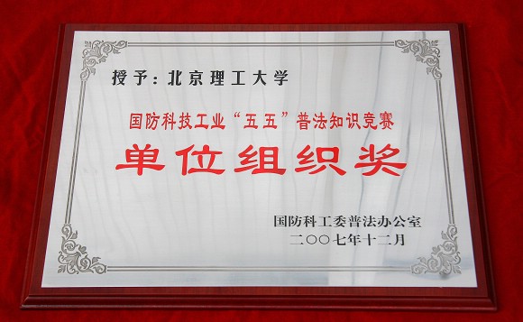 12月18日上午,国防科工委召开了“国防科技工业‘五五’普法知识竞赛总结暨颁奖会”,我校与陕西省国防科工委等10个单位获得了2007年国防科技工业系统“五五”普法知识竞赛“单位组织奖”,同时获得这一荣誉称号的高校还有哈尔滨工程大学。