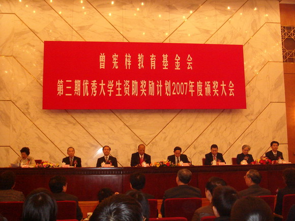 12月21日下午,曾宪梓教育基金会第三期“优秀大学生资助奖励计划”2007年度颁奖大会在人民大会堂举行。来自内地35所高校的1750名优秀贫困大学生获得总额为630万元的资助。教育部副部长袁贵仁、国务院港澳办副主任周波、共青团中央书记处书记贺军科和全国人大常委会委员、香港金利来集团有限公司董事局主席曾宪梓等出席了颁奖会并为学生代表颁奖。我校学生工作处处长刘明奇和11名获奖学生代表参加了颁奖仪式。