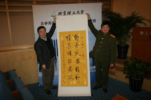 仪式过程中,总参政治部干部部副部长鲍廷祥大校代表总参向我校赠送了“传承延安精神,情系国防建设”的牌匾,党委副书记、副校长杨宾代表学校欣然接受。总参政治部主任冯寿淼少将对北京理工大学承接和完成此次培训工作表示感谢。并指出此次培训班特点突出:培训方式新,教学起点高,授课方法活,组织保障好。培训班成效明显,参训学员开阔了视野,提升了思维层次,培养了良好学风,积累了培训经验。最后,冯主任对参训学员提出了三点希望:一是要坚持终身学习;二是要注重实践运用;三是要提高创新能力。