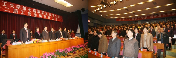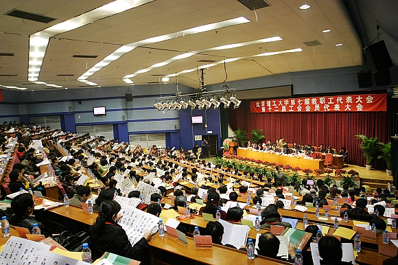 北京理工大学第七届教职工代表大会暨第十二届工会会员代表大会2007年12月27日在中心教学楼一层报告厅隆重举行,大会在雄伟的《国歌》声中胜利召开,中华全国总工会书记处书记陈荣书、北京市教育工会副主席刘欢、北京市教育工会副主席海淀区教育工委副主席乔健、北京市教育工会副主席 北京大学工会常务副主席孙丽、北京师范大学工会常务副主席丛玲、北京航空航天大学工会常务副主席秦蓉、中央民族大学工会常务副主席刘裕明、北京外国语大学工会常务副主席安国城、中国农业大学工会常务副主席张士杰、北京林业大学工会常务副主席朱逸民、中国协和医科大学工会常务副主席张有利、中央财经大学工会常务副主席李德铭、华北电力大学工会主席王玲、北京化工大学工会常务副主席谢光、北京信息科技大学工会常务副主席卢玲军、中国人民大学工会副主席范建东、北京工商大学工会常务副主席韩宝龙、中国青年政治学院工会常务副主席高宝中、首都医科大学工会常务副主席桑盛娟、北京印刷学院工会常务副主席陈俊平北京工业职业技术学院工会主席胡喜平,北京理工大学党委书记焦文俊、校长胡海岩、副书记、副校长杨宾,党委副书记工会主席侯光明、副书记杨蜀康,副校长赵长禄、孙逢春、杨树兴、赵显利、李和章出席了大会。教代会正式代表、列席代表、特邀代表、学生代表,北京大学等兄弟院校代表500余多人参加了大会。