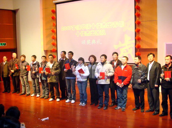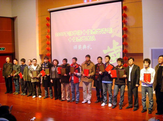 伴随着《卡门序曲》和主持人激昂的解说,“十佳青年、十佳团队”的宣传DV展现在了全院师生的眼前,虽然只有十分钟,但给2007级同学带来的振奋之情却久久不能平息。随后,学院领导为获奖个人和团队颁发了奖杯奖状。颁奖典礼结束后,2007级同学反映十分热烈,感触很深,他们纷纷表示,在新的一年里一定要更加努力,向自己心中的榜样看齐,争取早日成为宇航学院新一届的“十佳杰出青年”。