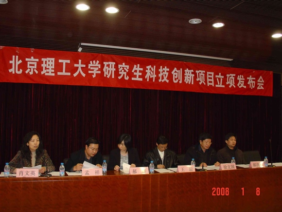 2008年1月8日下午,北京理工大学研究生科技创新立项发布会在研究生楼101教室召开。研究生院副院长王渝,科技处副处长徐文国,信息科学技术学院副书记、副院长郝群,机械与车辆工程学院副书记、副院长郝洪涛,化工与环境学院副书记、副院长孟祥以及相关学院研究生辅导员、研究生代表参加大会。研究生工作部部长肖文英主持大会。