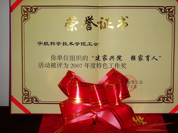 宇航科学技术学院工会在学院党委书记刘淑艳教授,院长黄风雷教授,工会主席华光副院长的直接领导下,在全体工会干部的辛勤努力和全体教职工的支持和配合下,圆满的完成了07年工会的各项工作和任务,顺利的通过了工会工作的各项指标,同时也达到了我们预期的目标。使我们学院的工会工作又跨上了一个新的台阶。我们决心在新的一年里在学院党政领导下,为实现和谐社会而努力!