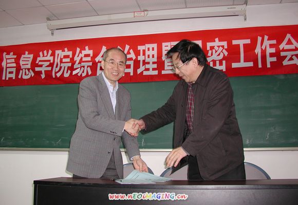 仲顺安院长分别与研究所代表和涉密项目组负责人代表签定了《2008年度信息学院社会治安综合治理目标管理责任书》和《2008年度信息学院保密工作目标管理责任书》。