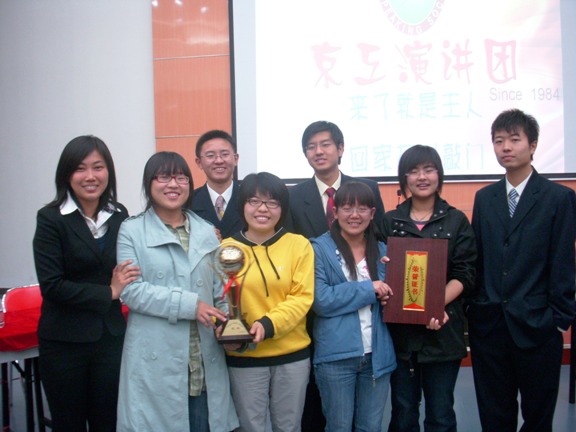 细数一下每场比赛的辩题:初赛,当今社会求专更有利于个人发展(对方:求博更有利);复赛:当今社会竞争高于合作(对方:合作高于竞争);半决赛:网络语言对语言文化进步利大于弊(对方:弊大于利);决赛:人类的伟大更在于思想(对方:更在于行动),值得一提的是,每一场的比赛都经过了前期的资料收集,赛前的反复讨论,现场的沉着应对,体现着8位队员的思想火花,凝聚着团队共同的努力成果。虽然有过矛盾,有过困难,但这个团队从3月23日的参加的第一场比赛起,在一个月的时间中,一路过关斩将,经过四场激烈的争锋,依次晋级,最终站到了比赛的最高领奖台。从始之终,作为一个团队,每一场比赛8名队员都集体讨论,一起准备材料,现场全部出席,可以说成绩的取得是大家一起努力的成果。